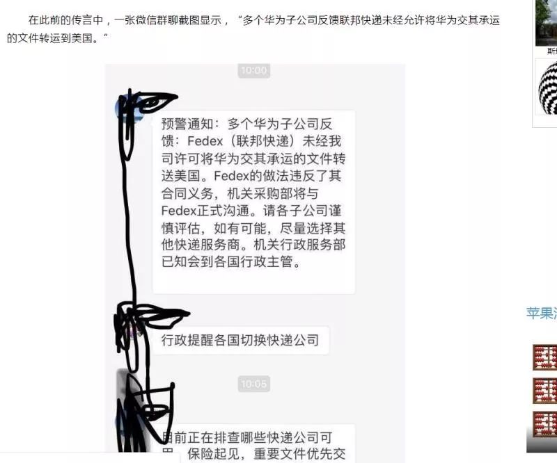 盡管聯(lián)邦快遞一再強(qiáng)調(diào)這是“孤立事件”,但在中國社交媒體上流傳的微信群截圖顯示,多個華為子公司早就有過相關(guān)反饋,稱聯(lián)邦快遞未經(jīng)華為許可將交其承運(yùn)的文煥轉(zhuǎn)送美國,并提醒各國切換快遞公司。